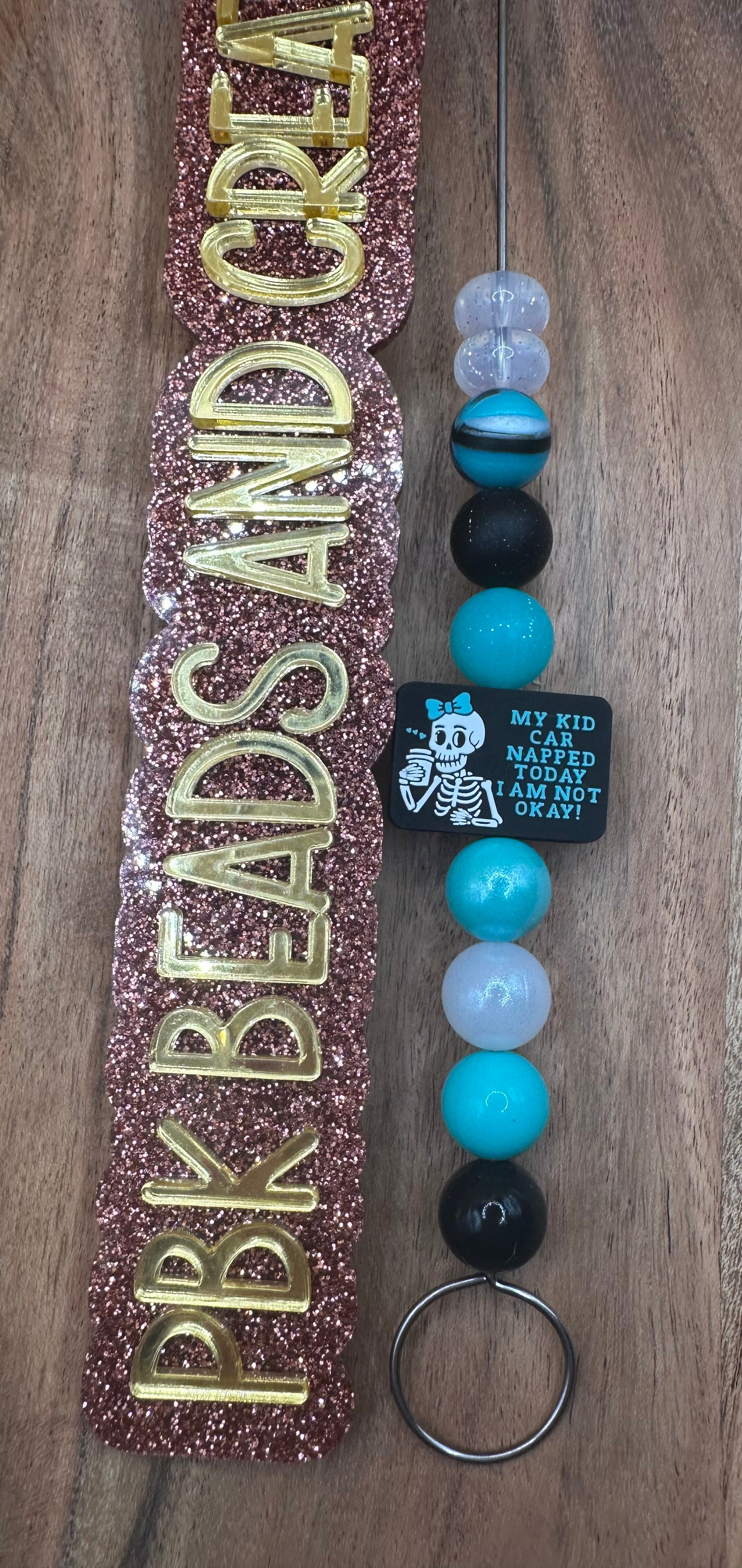 Matching beads (bottom to top)- black liquid, turquoise liquid, granny’s pearls opal, turquoise opal, turquoise glitter, black glitter, black and turquoise swirl, and clear glitter abacus.
