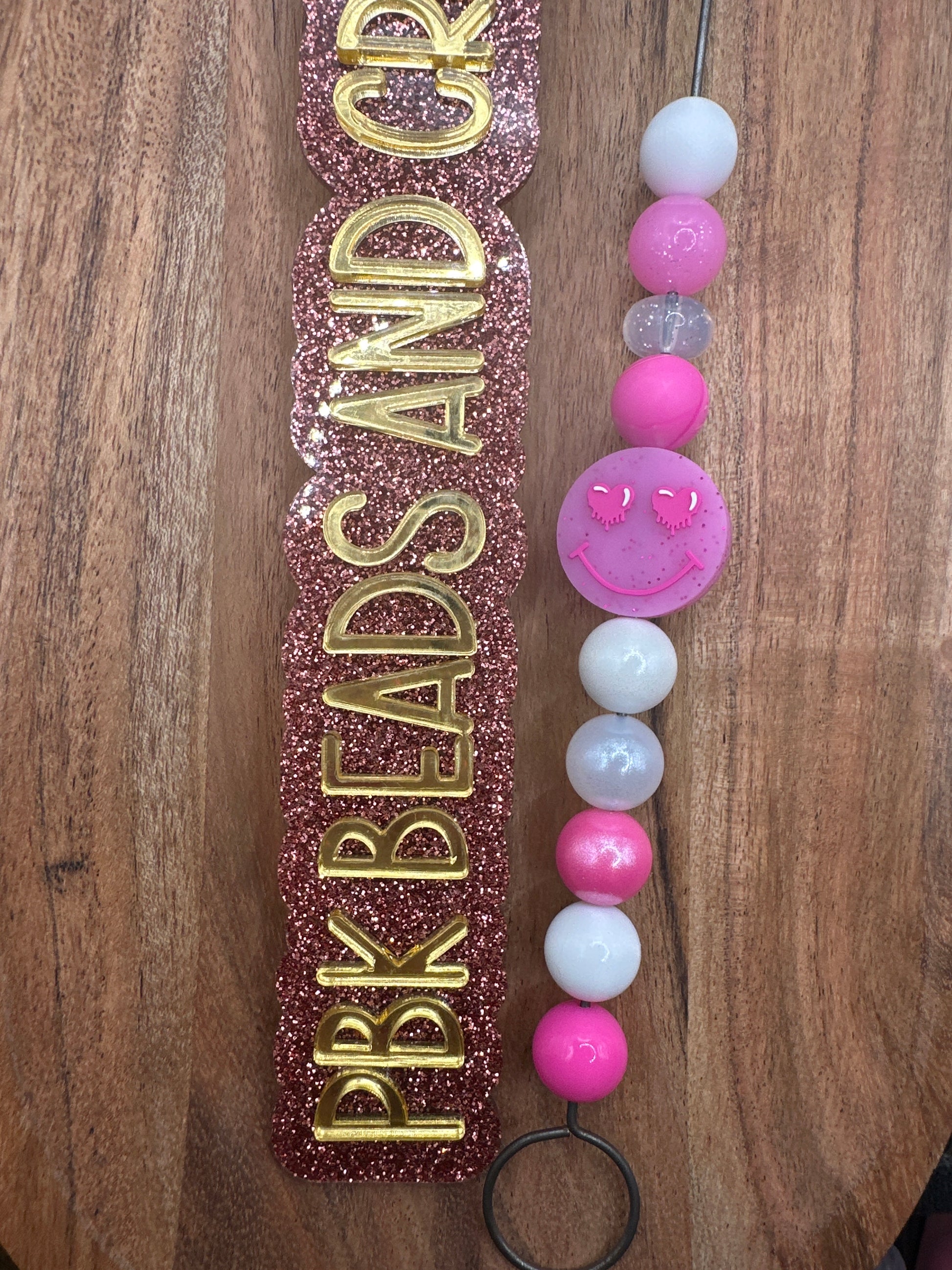 Matching beads (bottom to top)- Hot pink liquid, white liquid, hot pink opal, granny’s pearls, white opal, pink swirl print, clear glitter abacus, hot pink liquid glitter, and white solid.