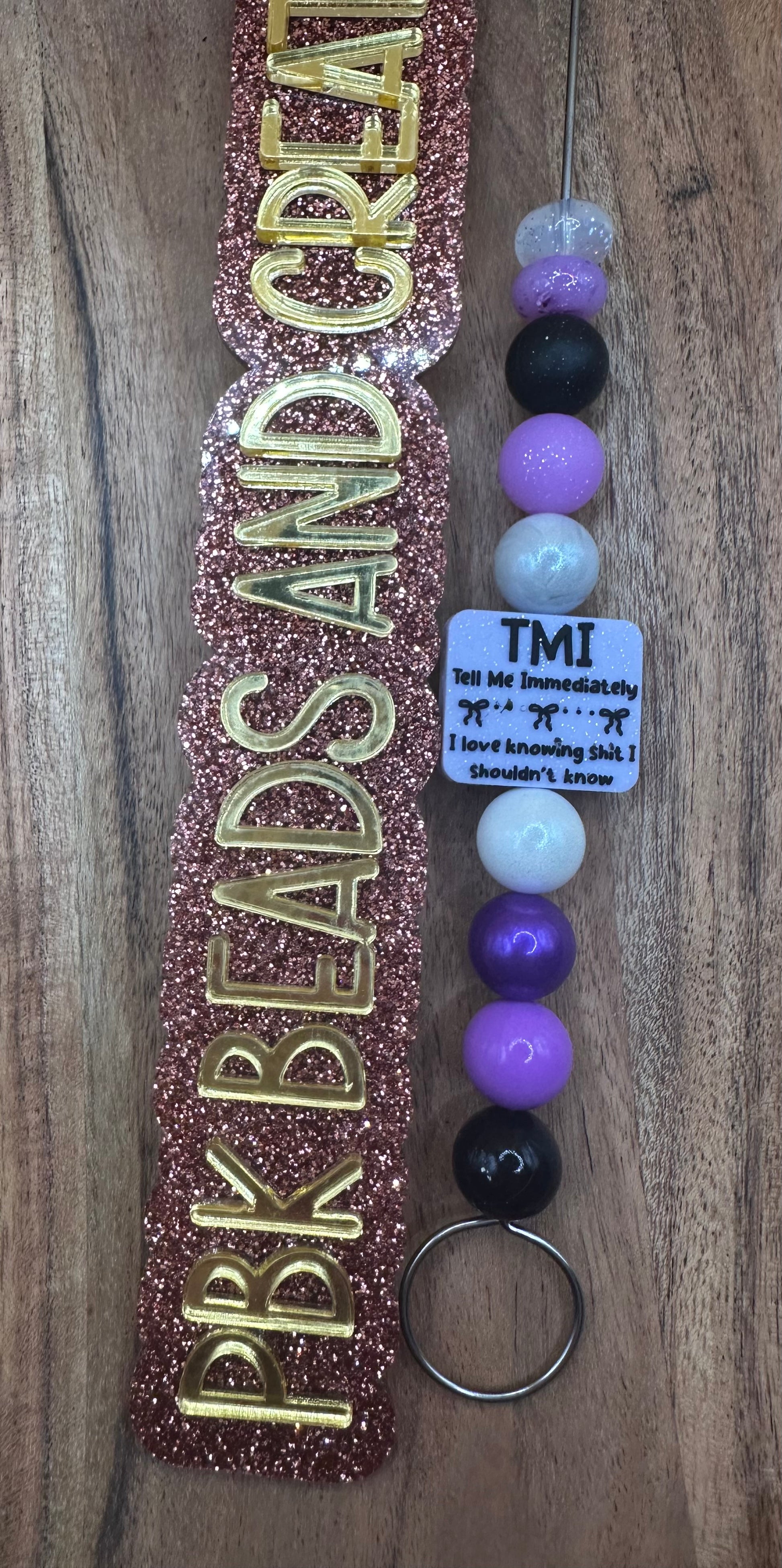 Matching beads (bottom to top)- black liquid, grape opal, dark purple opal, white opal, Smokey marble opal, purple glitter, black glitter, purple speckle abacus, and clear glitter abacus.